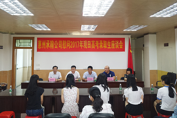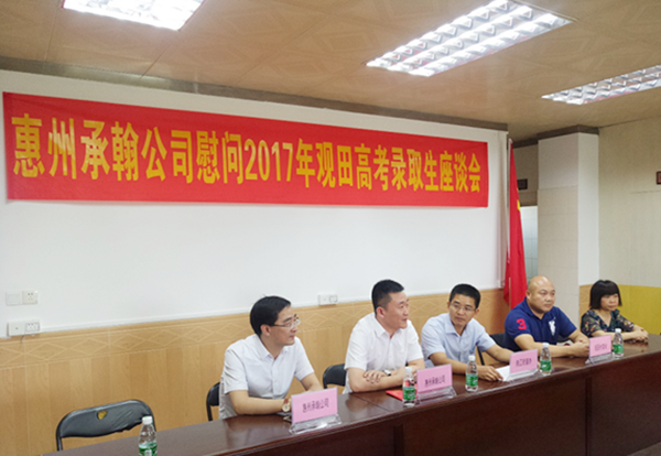 2017年8月25日上午,承翰集团惠州分公司一行在总经理张海涛、副总经理庄小波的带领下来到惠州市陈江街道观田村,开展了2017年高考优秀录取生的慰问活动,并组织了座谈会,与观田村领导一道为同学们送上美好祝愿。